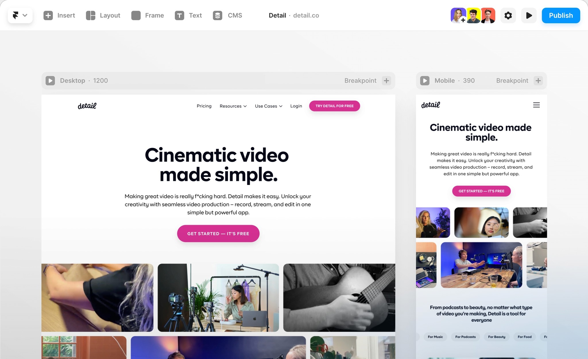 Framer’s canvas is incredible for web design. Create web pages with text, links, media, and animations—no code needed. Ready to ship? Publish your site with a single click.