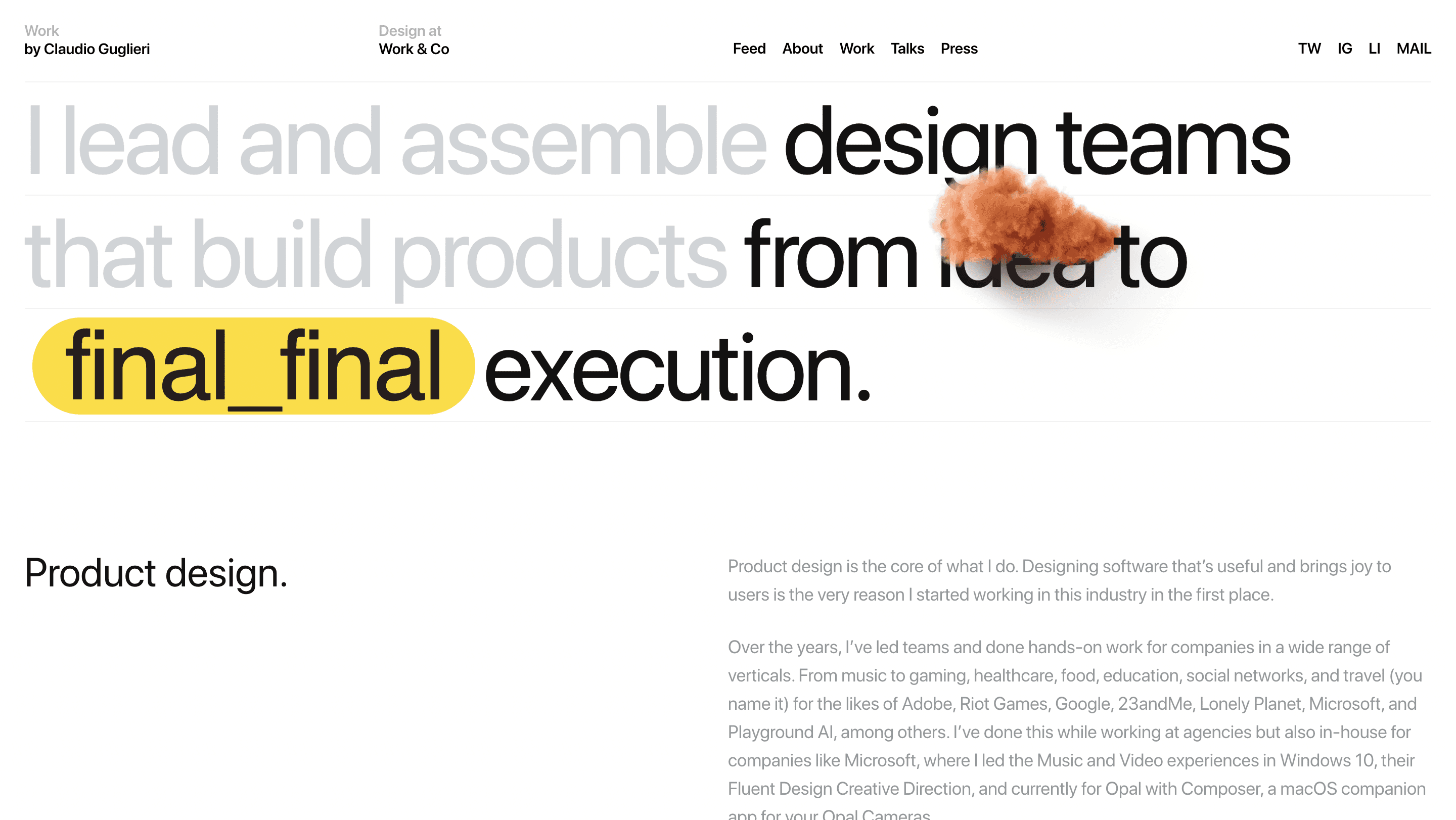 As a solo practitioner, Claudio Guglieri uses his website to articulate his philosophy as a consultant and team leader. The site offers past work as templates for future success. Claudio uses headings and text blocks to introduce himself, explain his approach, and highlight his successes.