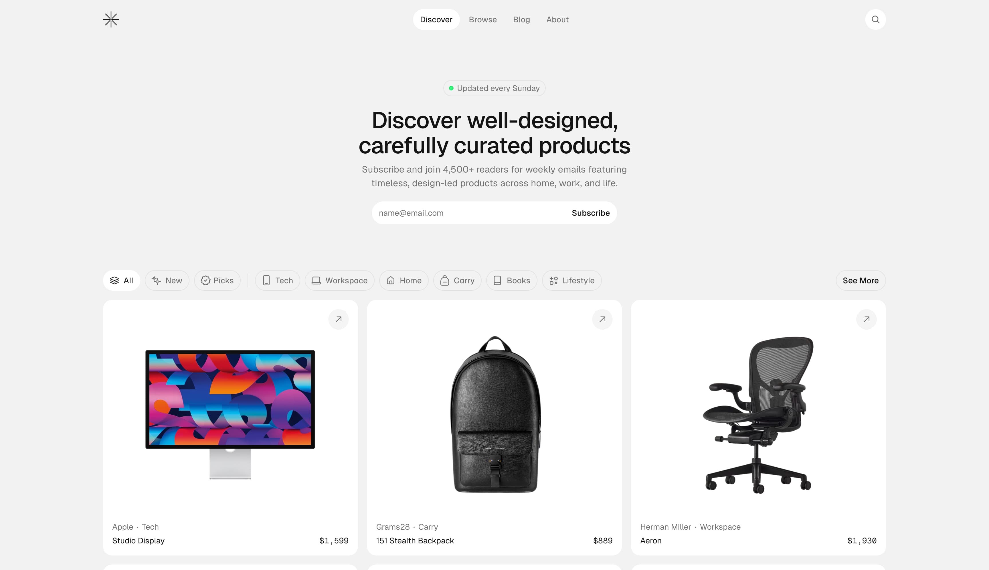 Curated Supply is just that—a website full of curated products. The homepage is not so much a cover page as it is a direct entry point into everything the site offers, from the product grid to the invitation to sign up for the newsletter. The uncluttered, white grid of products with minimal distractions or marketing copy reinforces the curated aesthetic. The category buttons feature exponents that show how many products are in each category, but they’re otherwise very muted, practically blending in with the grey background. The minimalist features—from the stark white backgrounds to the sleek, sans-serif font—are intentionally designed to let the design of each product take center stage.