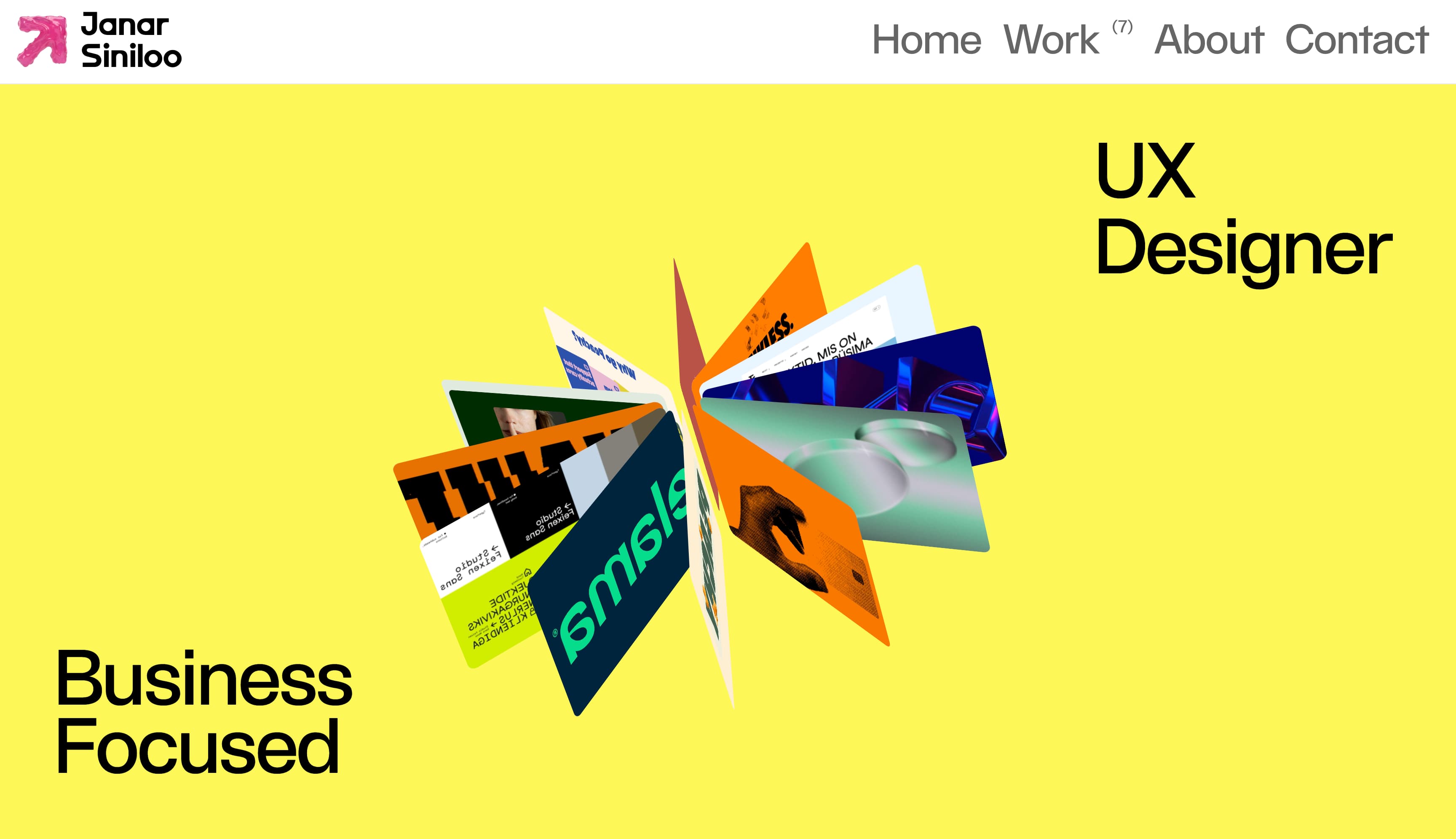 Janar Siniloo’s homepage makes a strong first impression. “Business Focused” sets the tone, while the role next to it shifts through a ticker, moving between different titles to show range and flexibility. It feels confident, but not rigid.