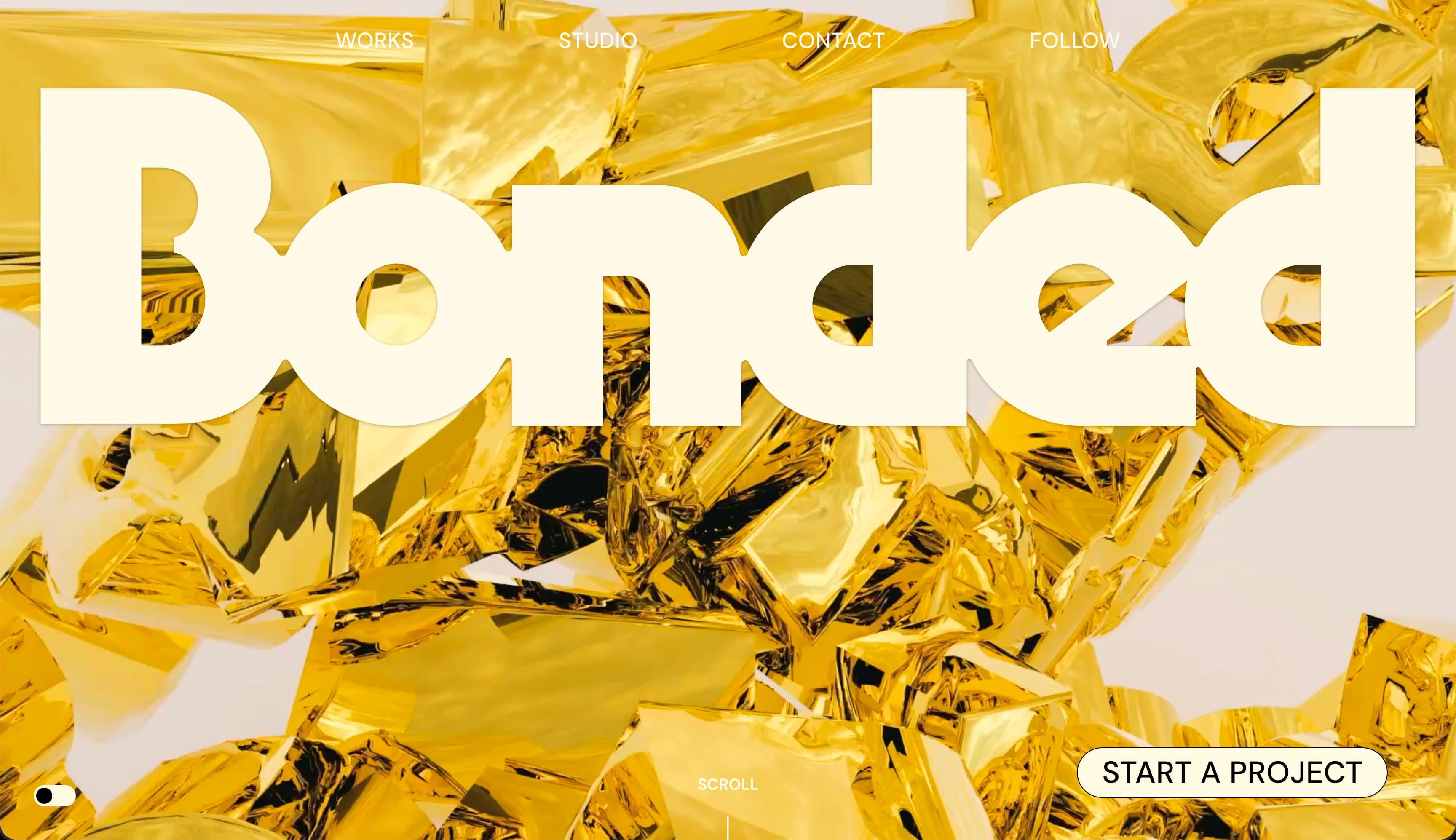 This boldly animated homepage from Madison, Wisconsin-based studio, Bonded, takes a maximalist approach, with a huge, thick-lined font headline and reflective gold background treatment of the studio name in the background. It’s eye-catching and feels luxurious.