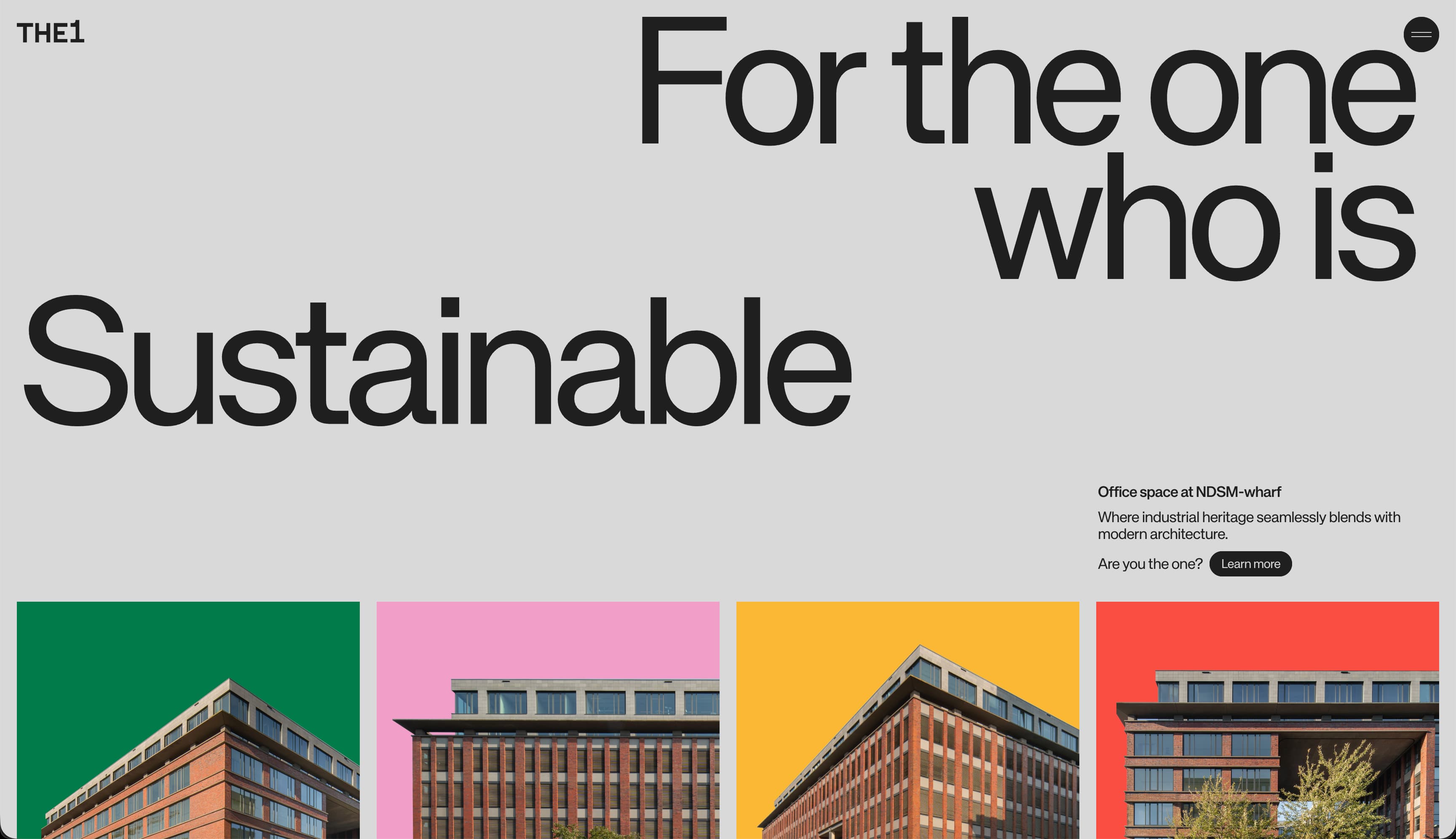 The1’s office space website bucks homepage design conventions in its industry. Leaning more on its brand color palette and typography than photography to tell its building’s story, it makes a personality-driven statement.