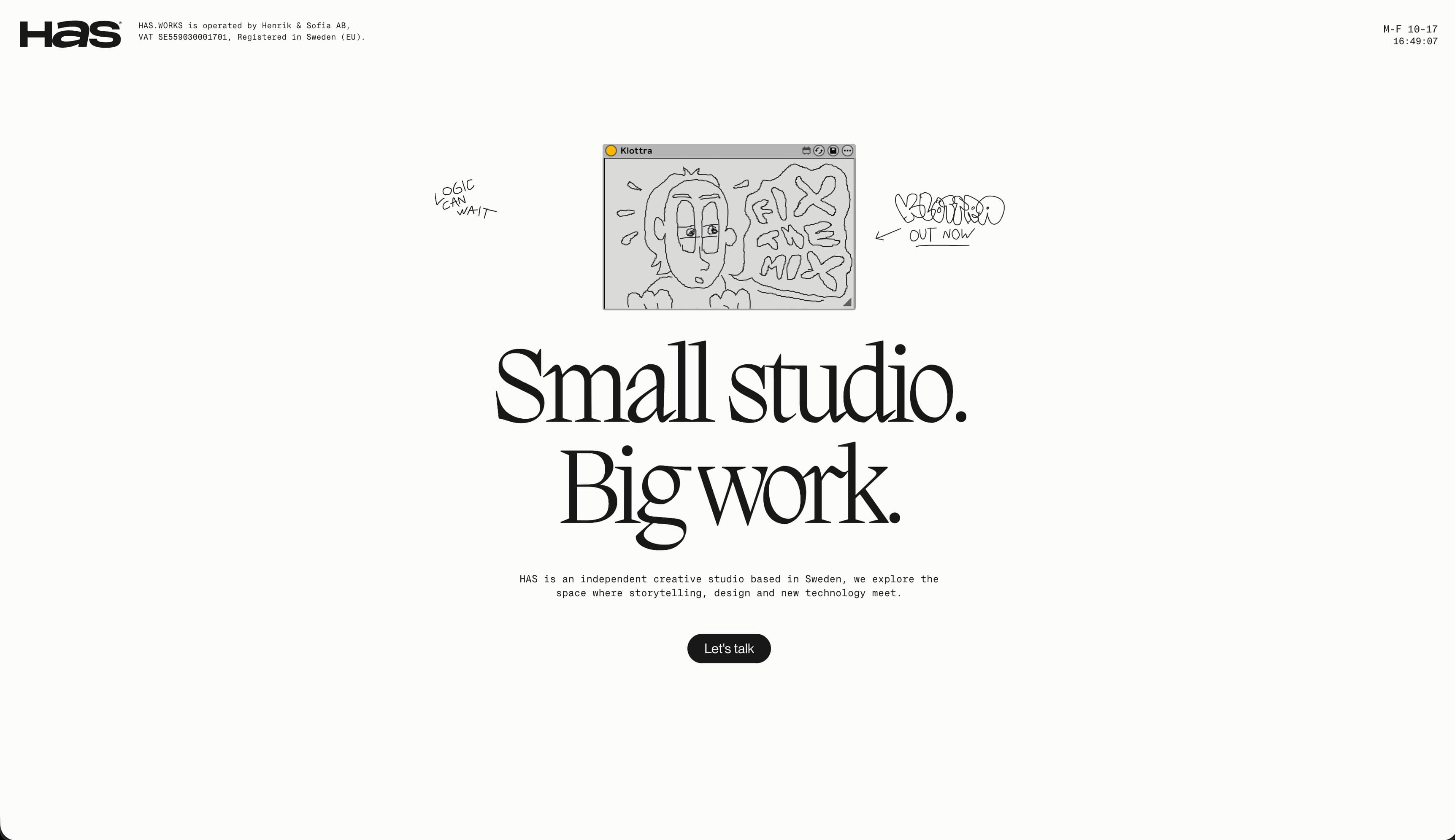 Load the homepage of Swedish design firm HAS.WORKS and you’ll immediately get a sense of who they are, creatively. The bold, oversized headline “Small studio. Big work.” offers the same thing: this is what the firm values and what clients will benefit from. The rotating silver dog figure catches your eye after the site loads. The contrasting button with the smiley face image on it invites you to click and injects a sense of humor into the otherwise reserved design. When you do click, the rotating figure changes to a tomato, a rock, a cowboy robot, and more. It’s a whimsical button that expresses the personality of the firm.