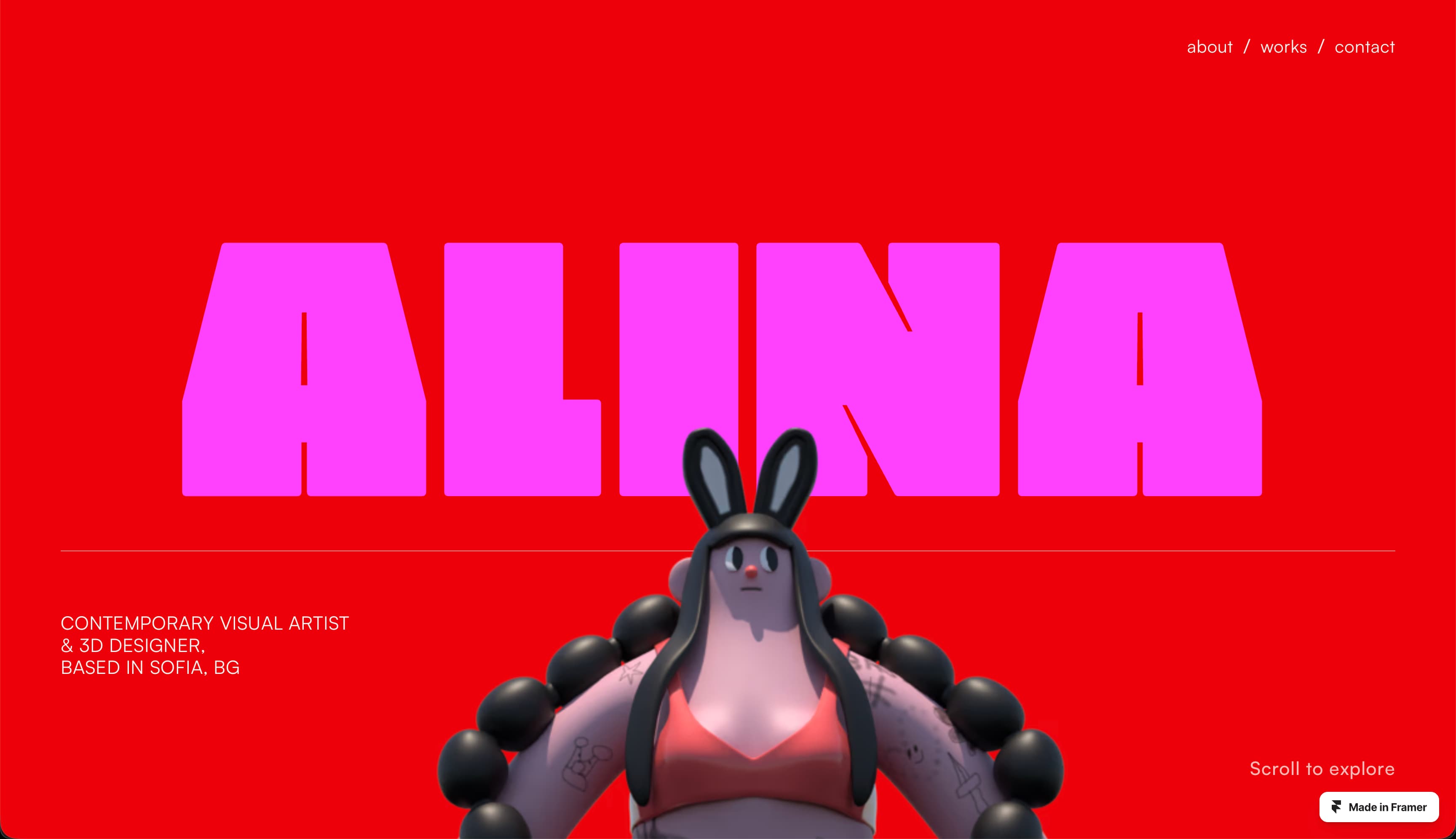 Alina Papazova, a visual artist and 3D designer from Bulgaria, uses a mix of saturated colors, contrasting fonts, and a dynamic 3D graphic to showcase her multidisciplinary expertise. As you scroll down the page, a parallax effect causes the 3D figure to twirl and zoom in, drawing you into an immersive experience. It then cleanly transitions into a WORKS section that feels more gallery-like to let the photography of real-world art installations take focus. It brings the artist’s diverse work into one cohesive vision.