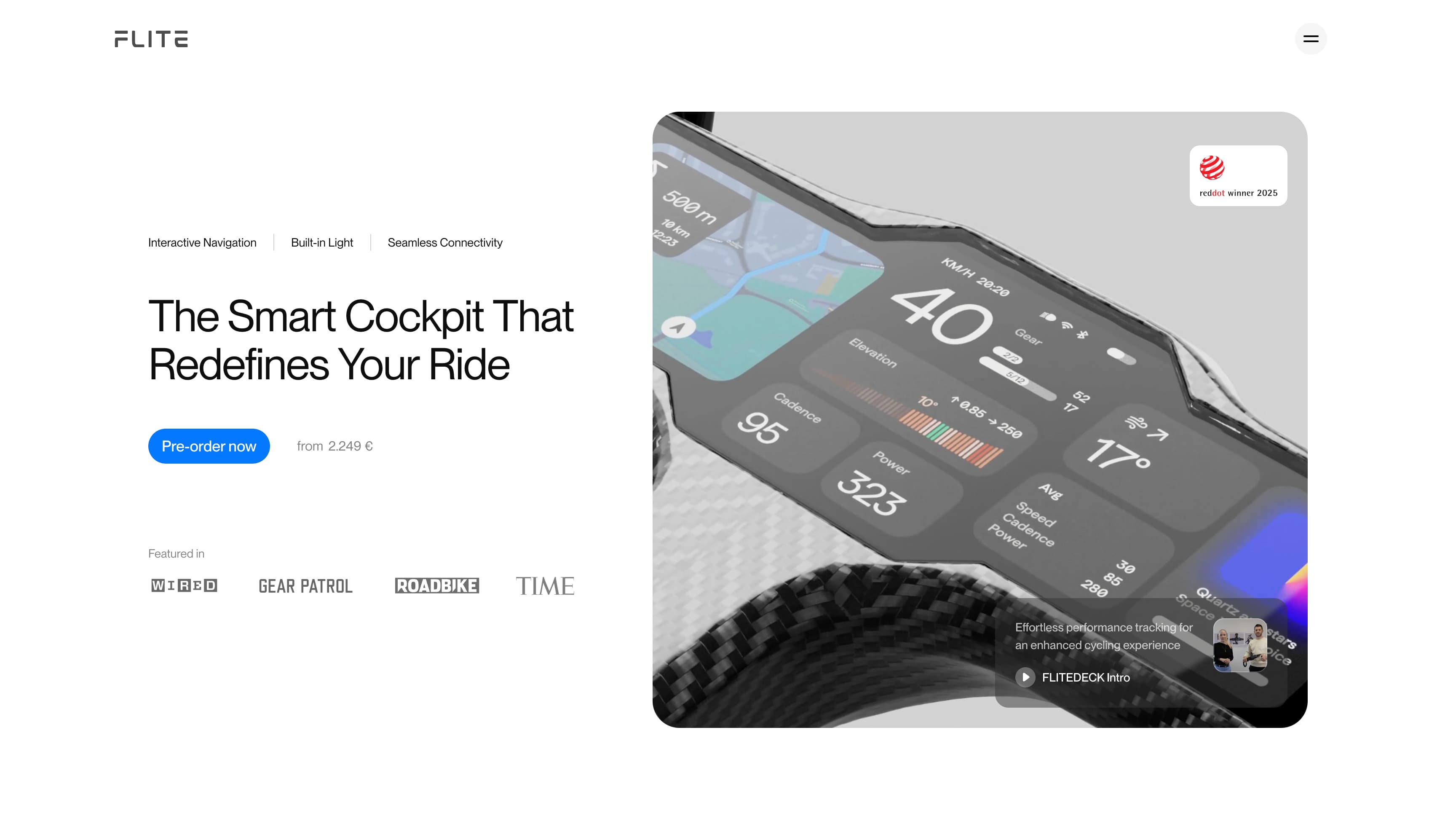 Flite sells high-tech bike handlebars that collect ride data. Instead of showcasing a range of products, the homepage narrows in on the brand’s signature offering with a large animated image. It feels engineered and intentional, a statement of industrial design rather than marketing.