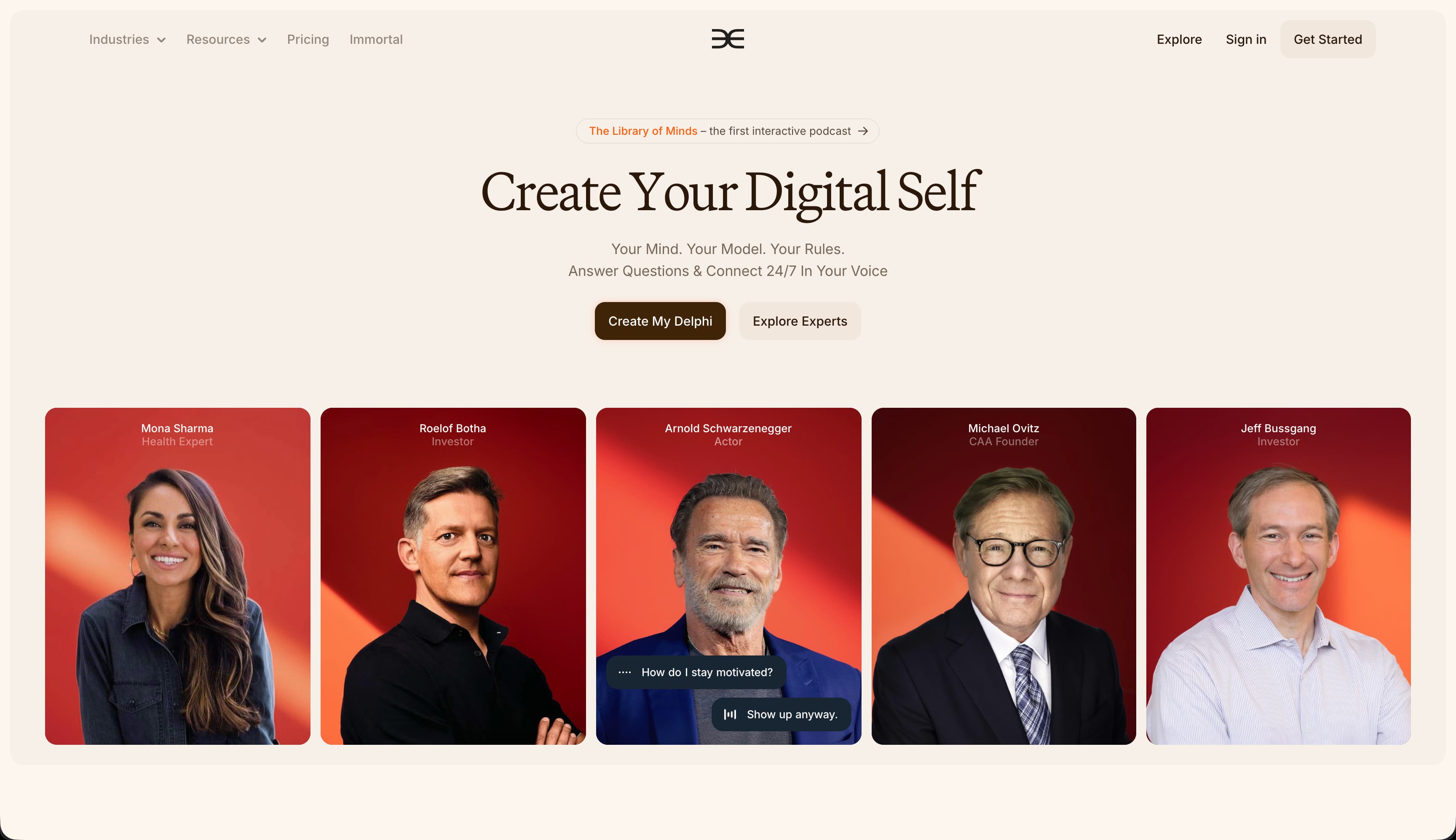 Delphi uses AI to create digital personas for experts and creators that can help manage online relationships with their users. Because the product is in the emergent and constantly evolving AI space, Delphi’s homepage has a lot to explain: what the product is, who uses it, and how it works. But it simplifies the user experience with movement, contrast, and pacing. The portraits of business leaders and celebrities slide into view, each framed consistently on similarly colored backgrounds. The dark “Create My Delphi” grabs attention, while lighter buttons encourage exploration, creating a branded experience instead of plain marketing copy.