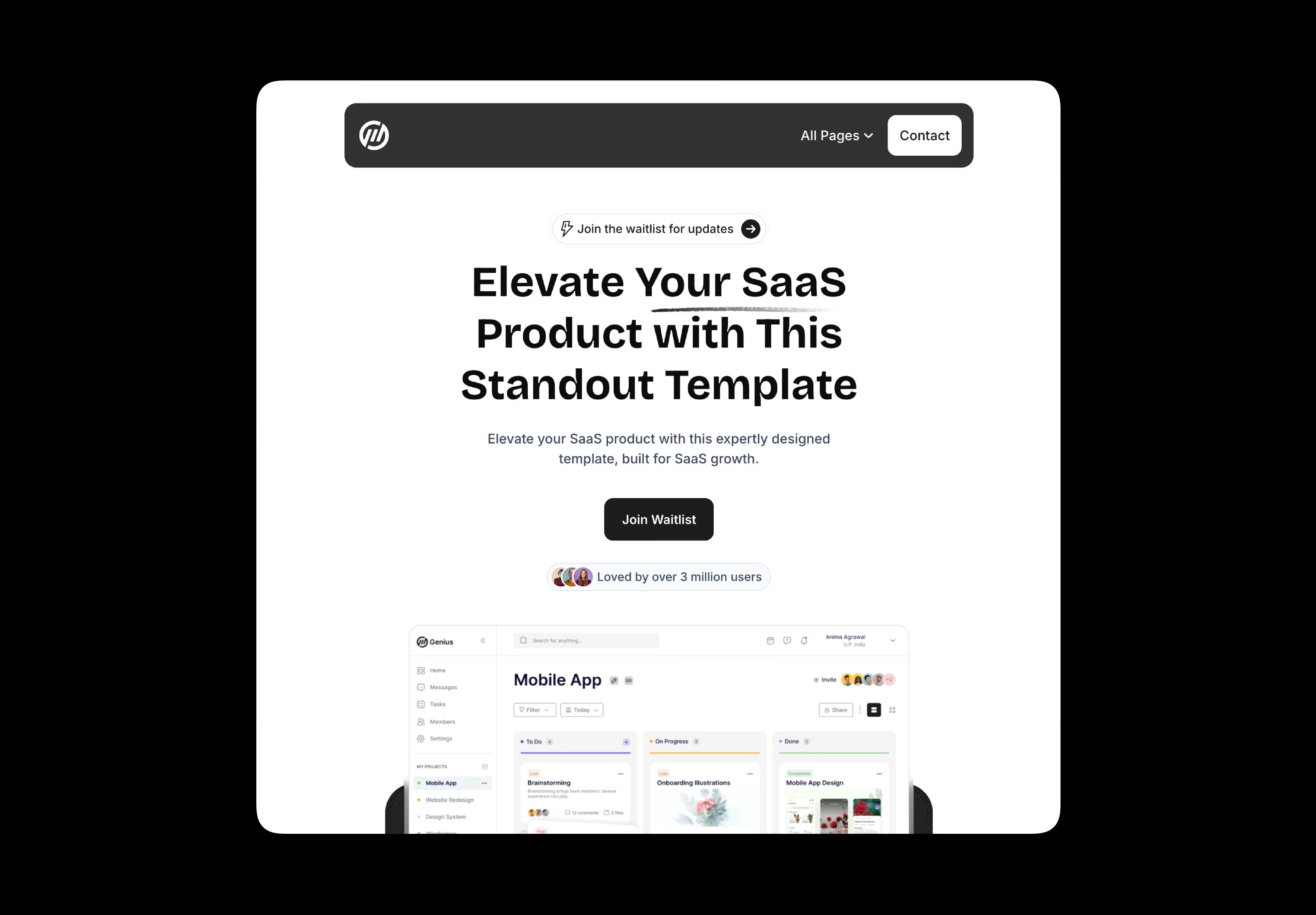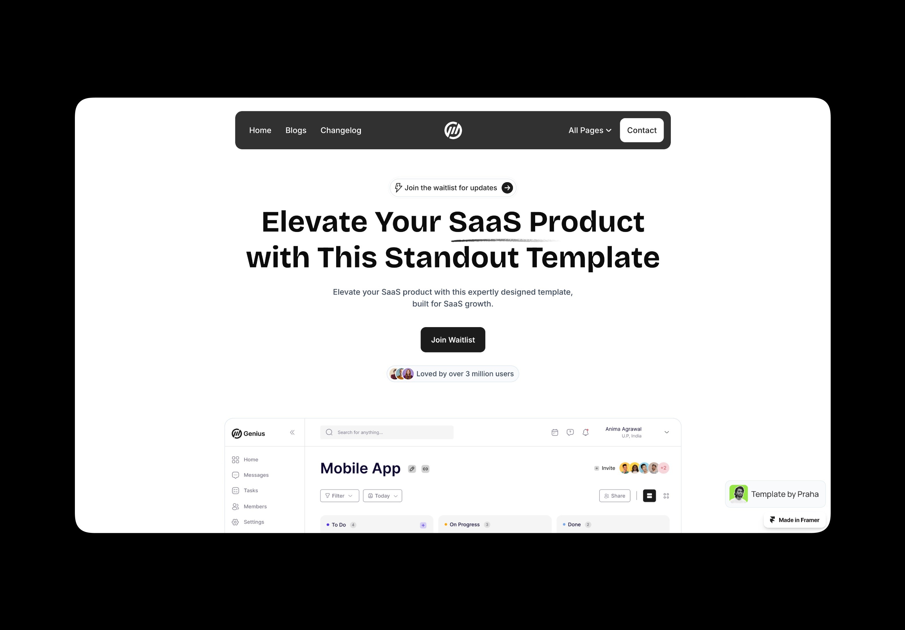 Take the Genius template from the Framer Marketplace. At 1440 pixels wide, the layout features a full-width hero image paired with a prominent headline and navigation spanning the top of the page, creating a clear and confident first impression on larger screens.