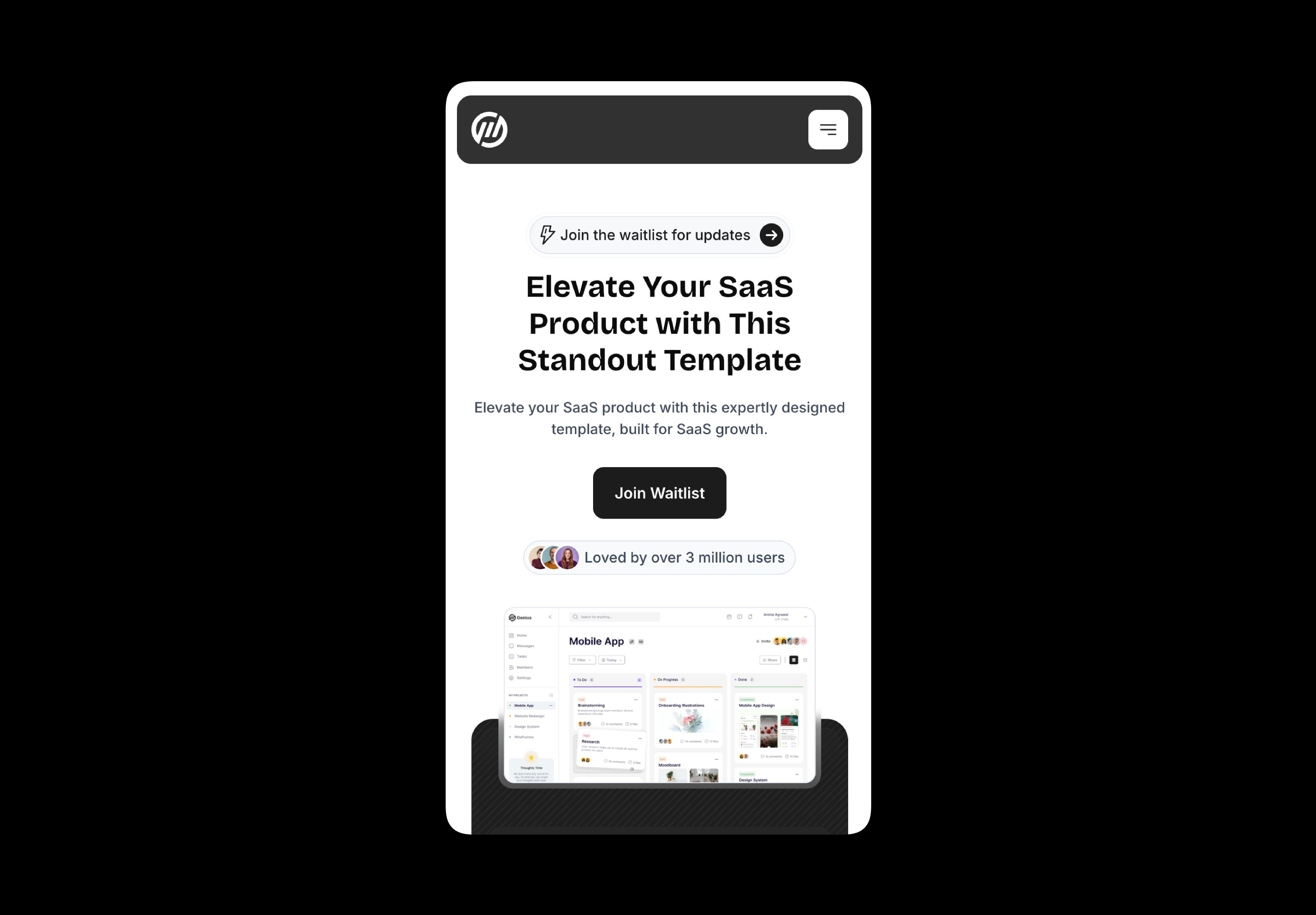 The headline scales down slightly around 1100px, but the more noticeable change hits at around 768px, where the headline shrinks further, the main menu becomes a hamburger, and the hero image stacks above the text container below, appearing much smaller. The whole design looks phone-ready and scales down easily from here.
