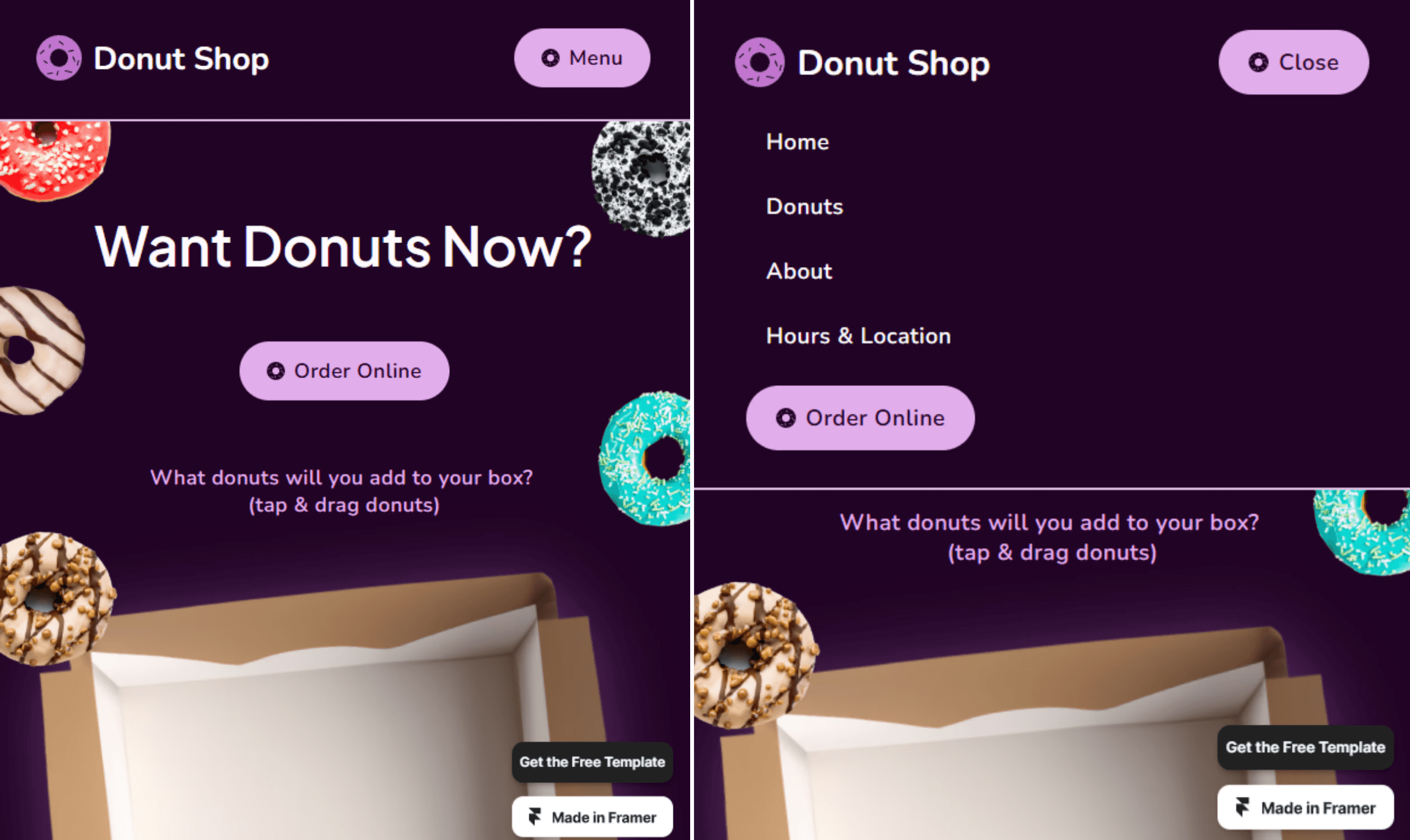 Donut Shop, a Framer template, shows this in action. It also features another user-friendly touch: after opening the menu, “Menu” changes to “Close” so users know how to make it go away.