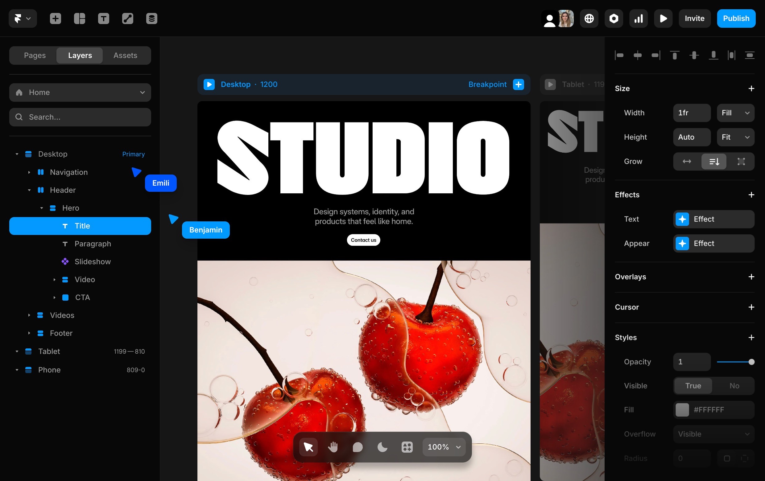 Promote your designs to Web Pages. Continue to tweak, add breakpoints, animations, interactions. All done? Just publish.