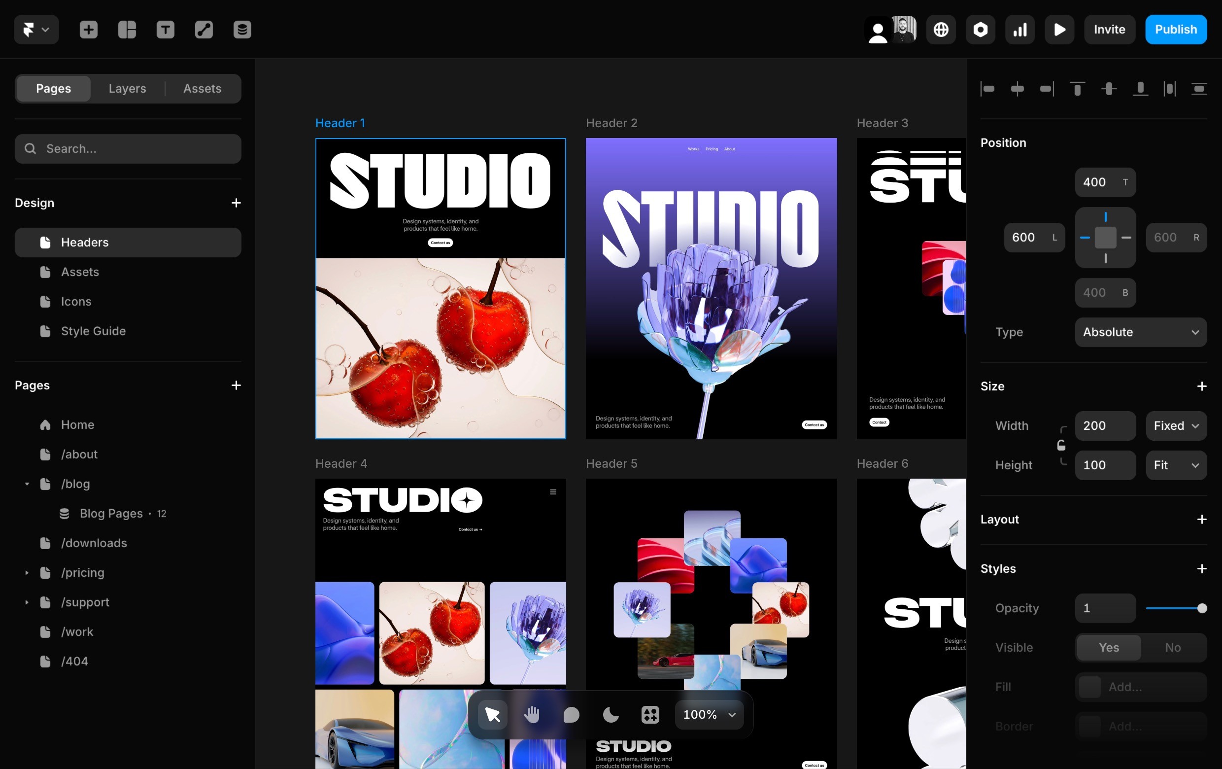 Skip Figma imports and start designing directly in Framer. Design Pages let you explore freely like Figma’s design canvas.