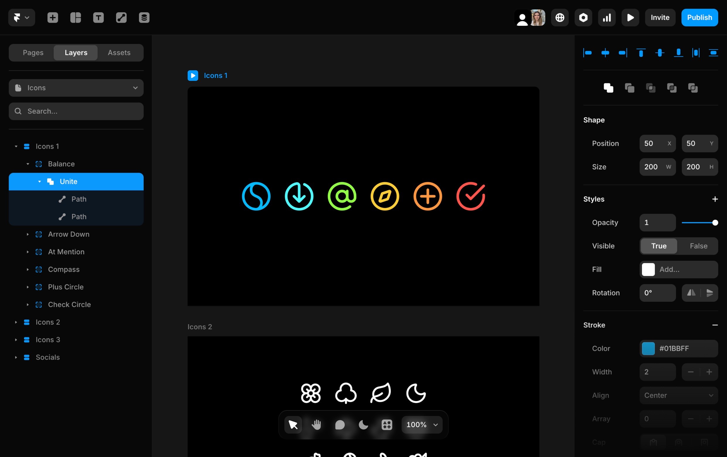 Vector Drawing. Draw icons or glyphs with precision using booleans and paths.
