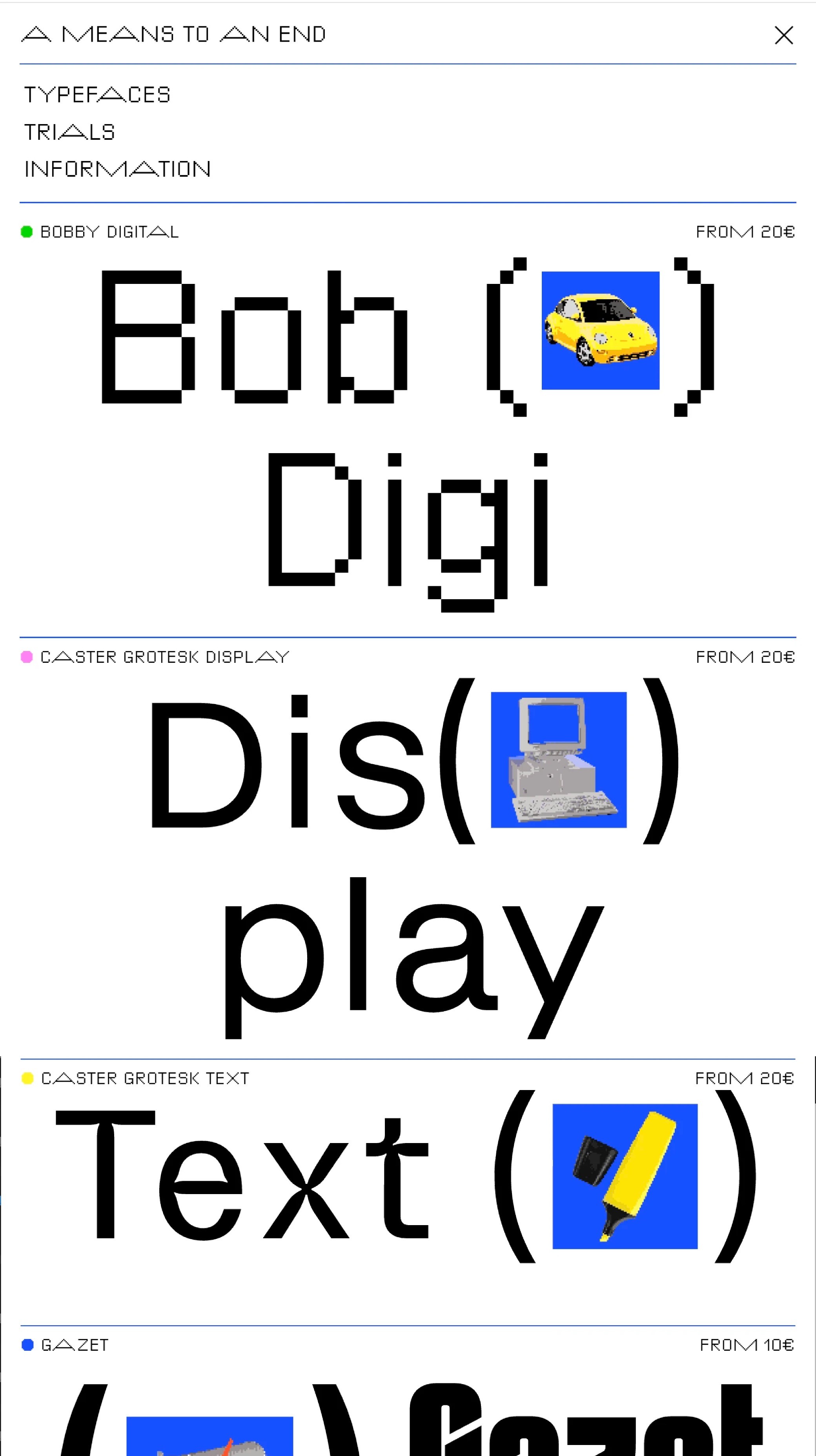 A MEANS TO AN END is a type foundry exploring typefaces as functional structures. The website provides a space to test, access, and download trial fonts, extending the idea of use as a guiding principle.
