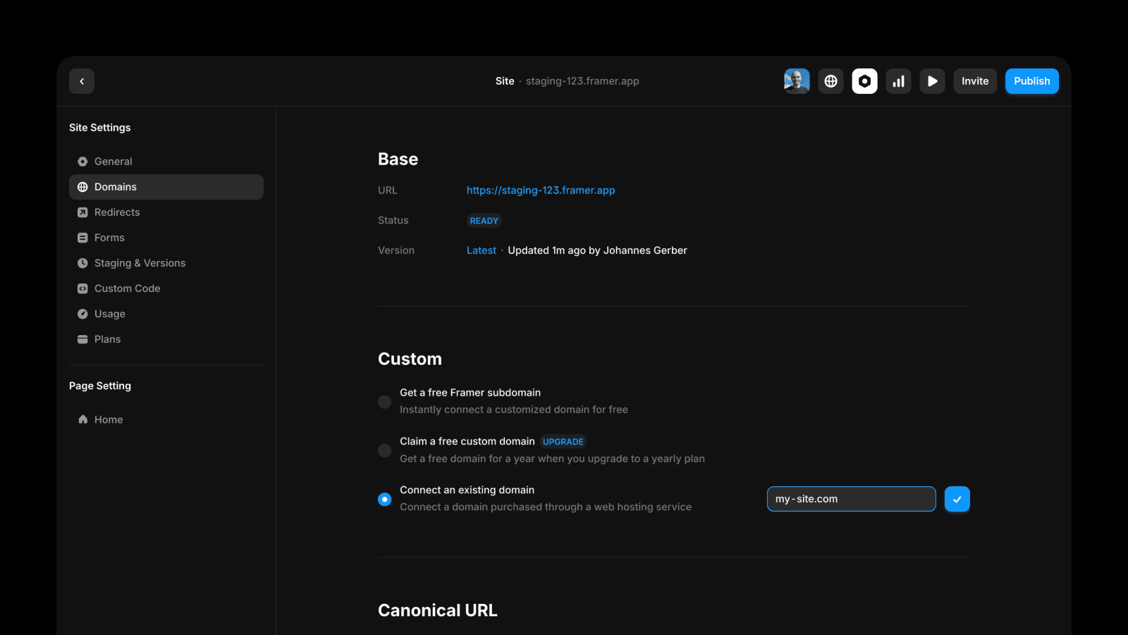 Publish you project again. Visit the staging link of your site staging-123.framer.app to make sure everything is working as expected.