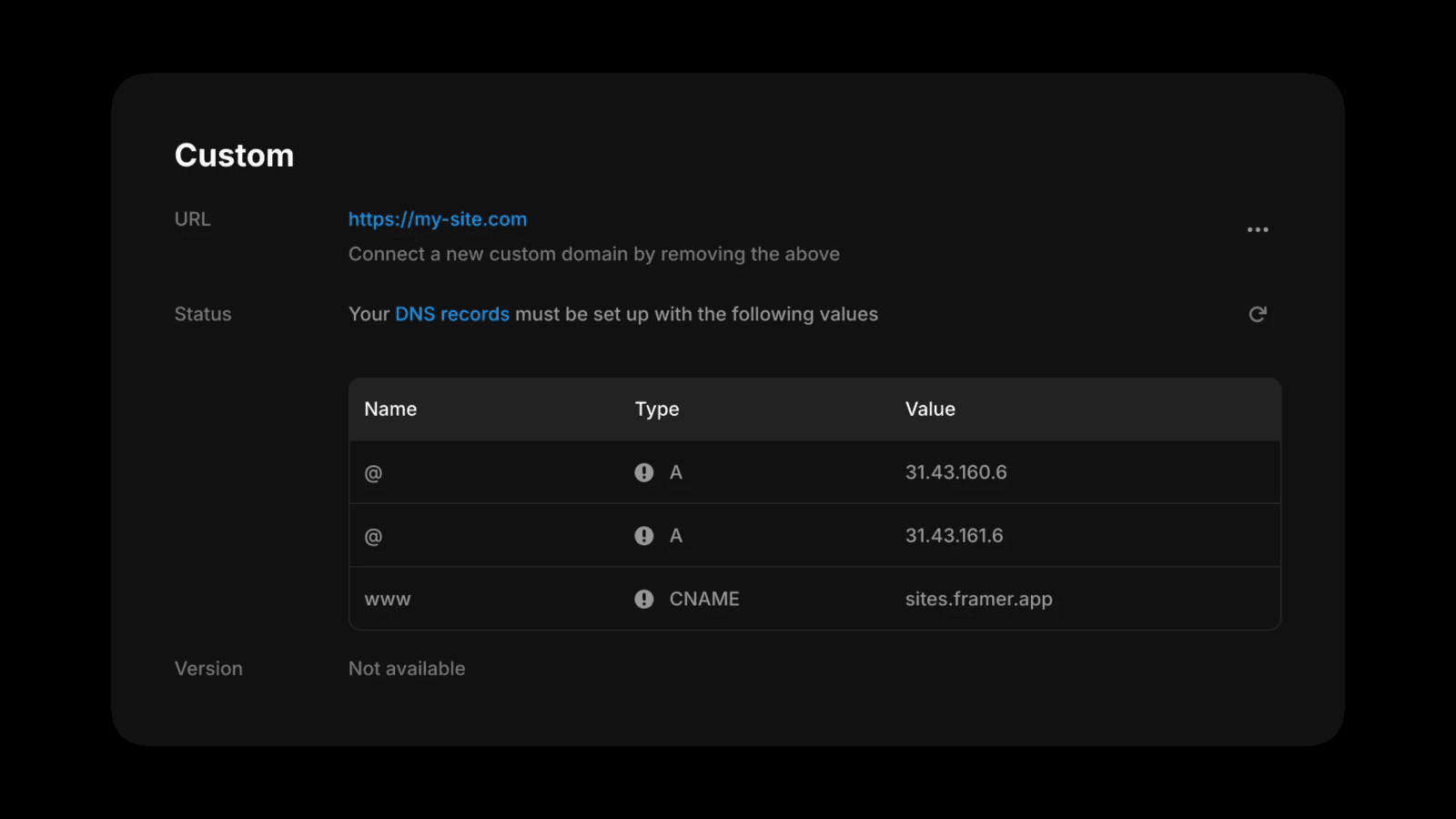 Important: Don't make any DNS changes on your domain provider side just yet! (The connection of a custom domain is needed to access the Advanced Hosting dashboard in Framer.)