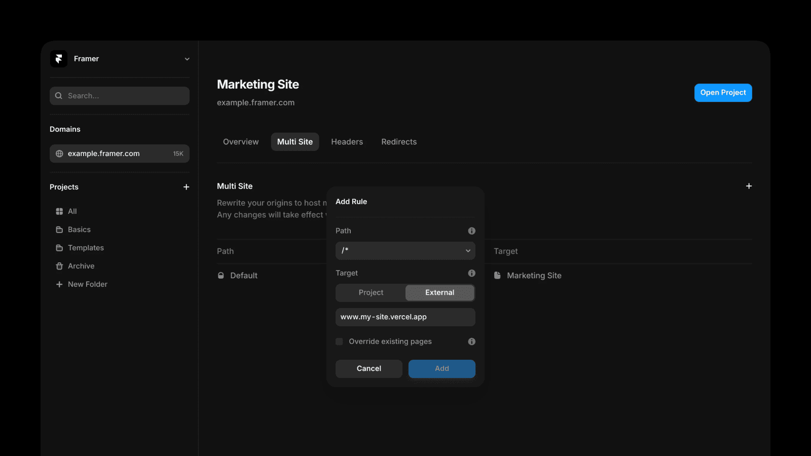 In the Framer dashboard, select your domain example.framer.website in the sidebar and add the rewrite rules in the Multi Site tab. Learn more about Multi Site rewrites.