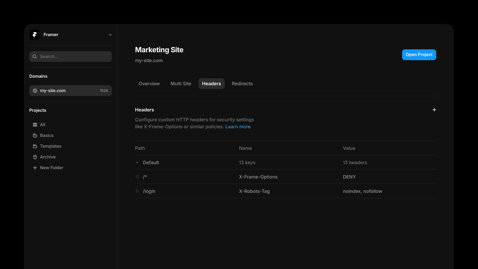 Important: Only custom headers set on your main project are applied to responses. If a path is rewritten to another Framer project or external origin, any custom headers configured on those target projects are not forwarded.