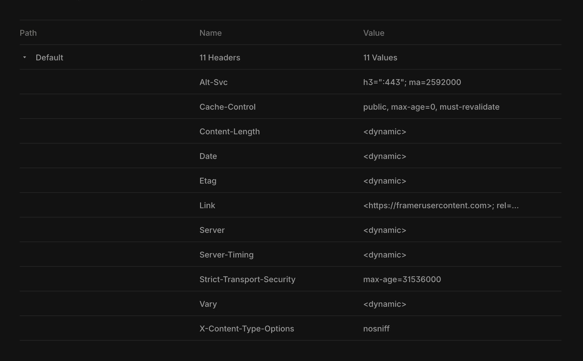 Framer automatically sets certain default headers for all sites. You can view these in the Headers tab under the "Default" section. Custom headers you add will supplement or override these defaults where applicable.