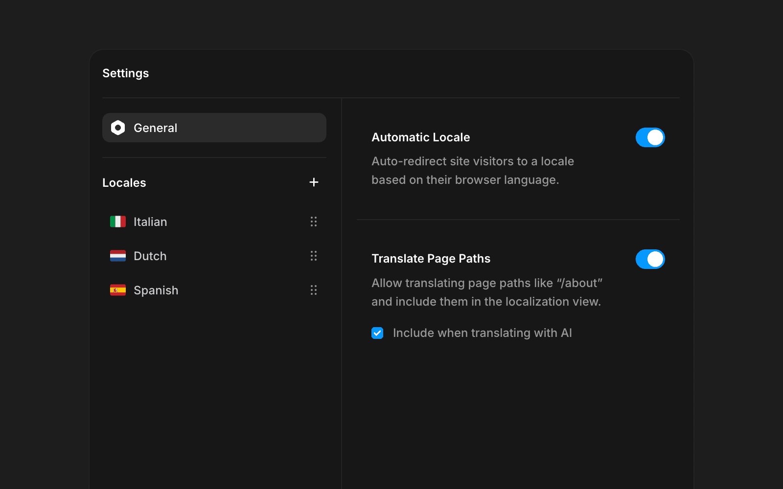 If you already translate CMS slugs (such as blog posts), this option is enabled by default. You can also enable AI translation for page paths if you plan to use AI within Localization.