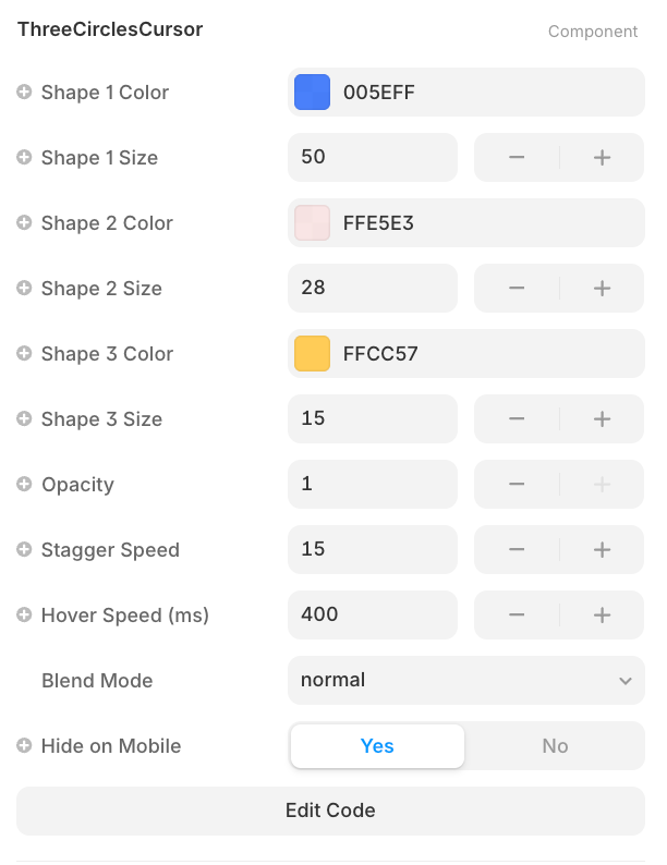 The blend mode control is where the real magic happens. Set it to screen on dark backgrounds or multiply on light ones to let the circles interact with your page content rather than sit on top of it. Combined with the opacity slider, you have full control over how present or subtle the effect feels.