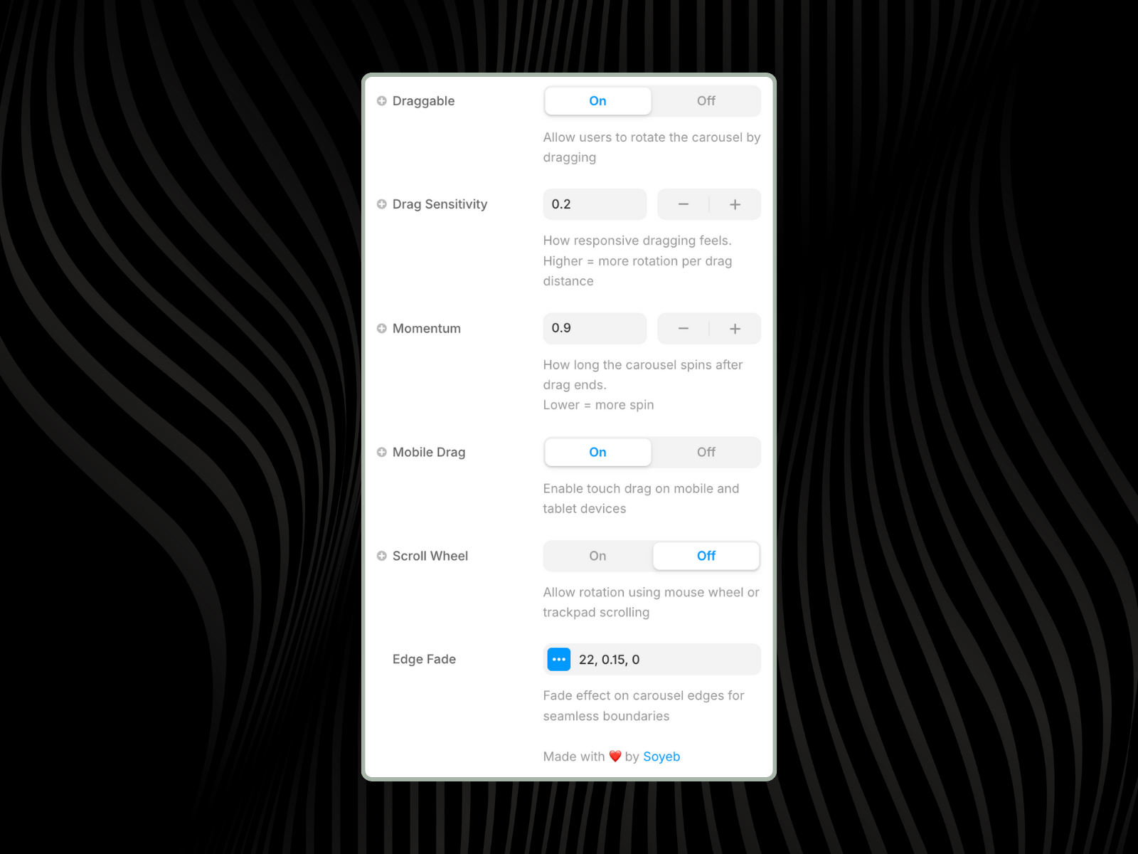 Momentum – Configure how long the momentum carousel continues spinning after release for realistic motion.