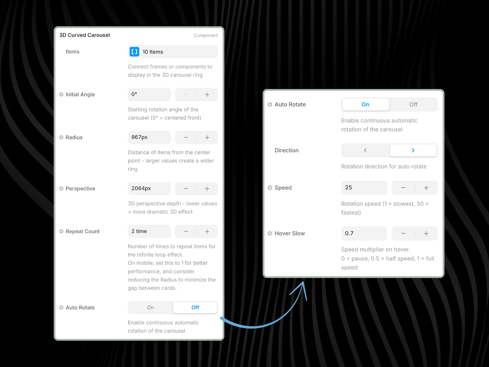 Auto Rotate – Enable or disable continuous rotation for a smooth carousel motion.
