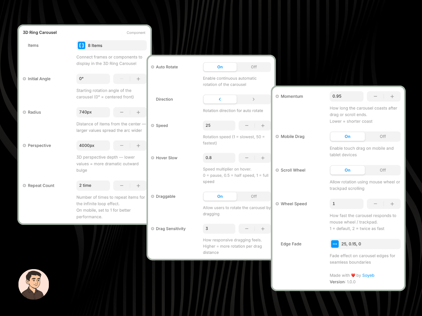 3D Ring Carousel creates a true spatial experience - items wrap around a convex ring, glide with momentum, and respond naturally to drag, swipe, and scroll. The result feels closer to a physical object than a typical slider.