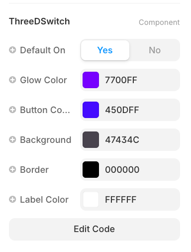 Interactive 3D switch with realistic perspective depth, flickering light effects when active, and fully customizable colors. Add dimension to your designs.
