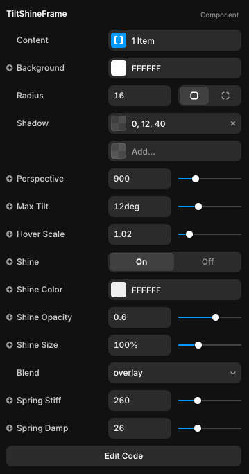 Transform any static frame into a visually engaging 3D interactive card with the Tilt Card Component. Designed to respond to cursor movement, this component creates a smooth tilt effect that adds depth, motion, and a premium feel to your interface. Whether you're showcasing products, portfolio pieces, or key content, it instantly makes your design more dynamic and interactive.