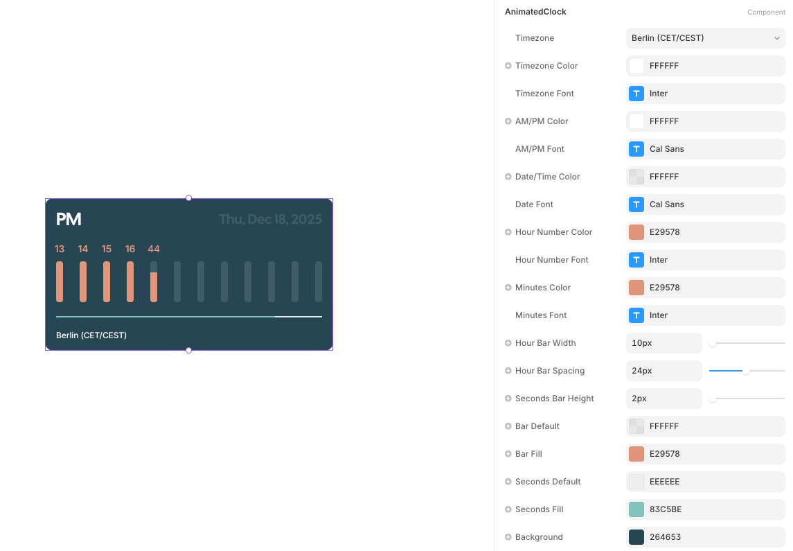 The component is an Animated Bar Clock with Hour, Minute & Second fill based on current time + user interaction to change timezone. The clock time is based on the 24-hour system changing from AM to PM.