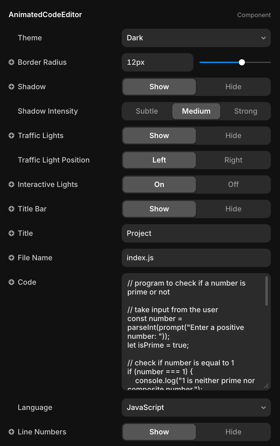 Bring your code to life with Animated Code Editor, a beautifully crafted component that recreates the look and feel of modern IDEs like VS Code—right inside Framer. Featuring smooth typing animations, professional syntax highlighting, and authentic MacOS window styling, it turns static snippets into engaging visual experiences.