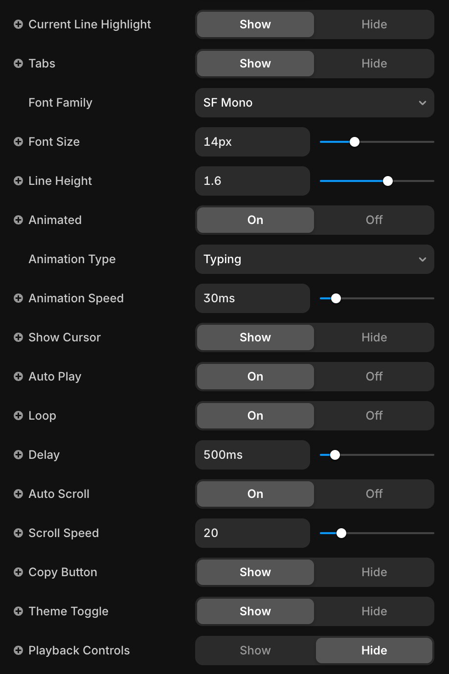 Interactive Controls – Copy-to-clipboard, theme toggle, and playback controls