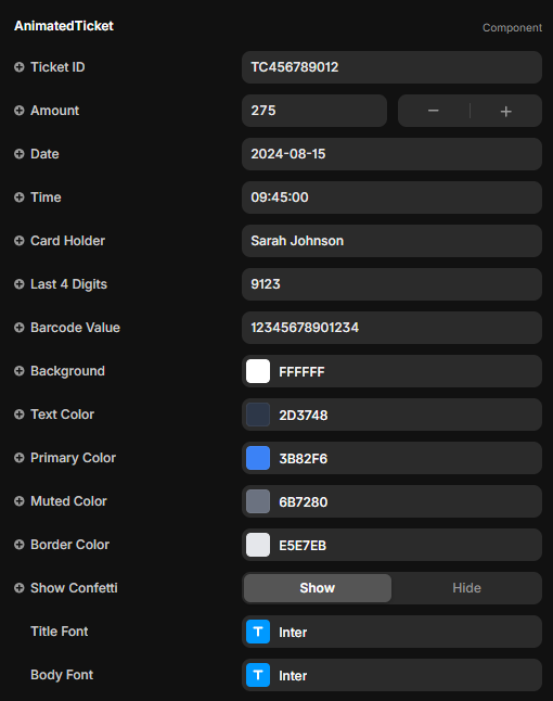 ⚡ Simple SetupDrag the AnimatedTicket onto your canvas, update the ticket details, and customize the style ready in minutes.