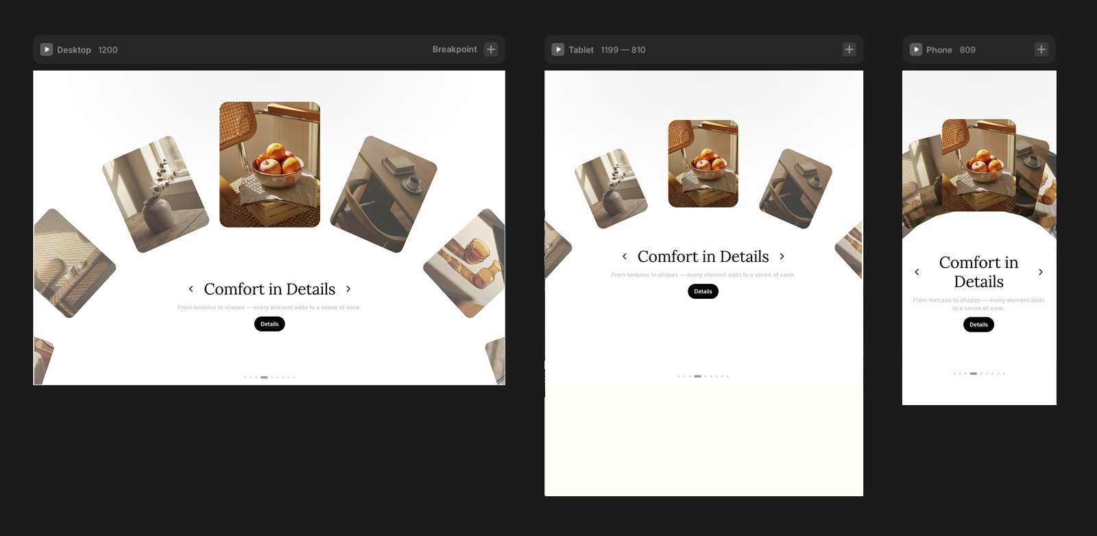 True responsive behavior: The component adjusts its layout logic based on screen width, so the carousel keeps its visual clarity across desktop, tablet, and mobile.