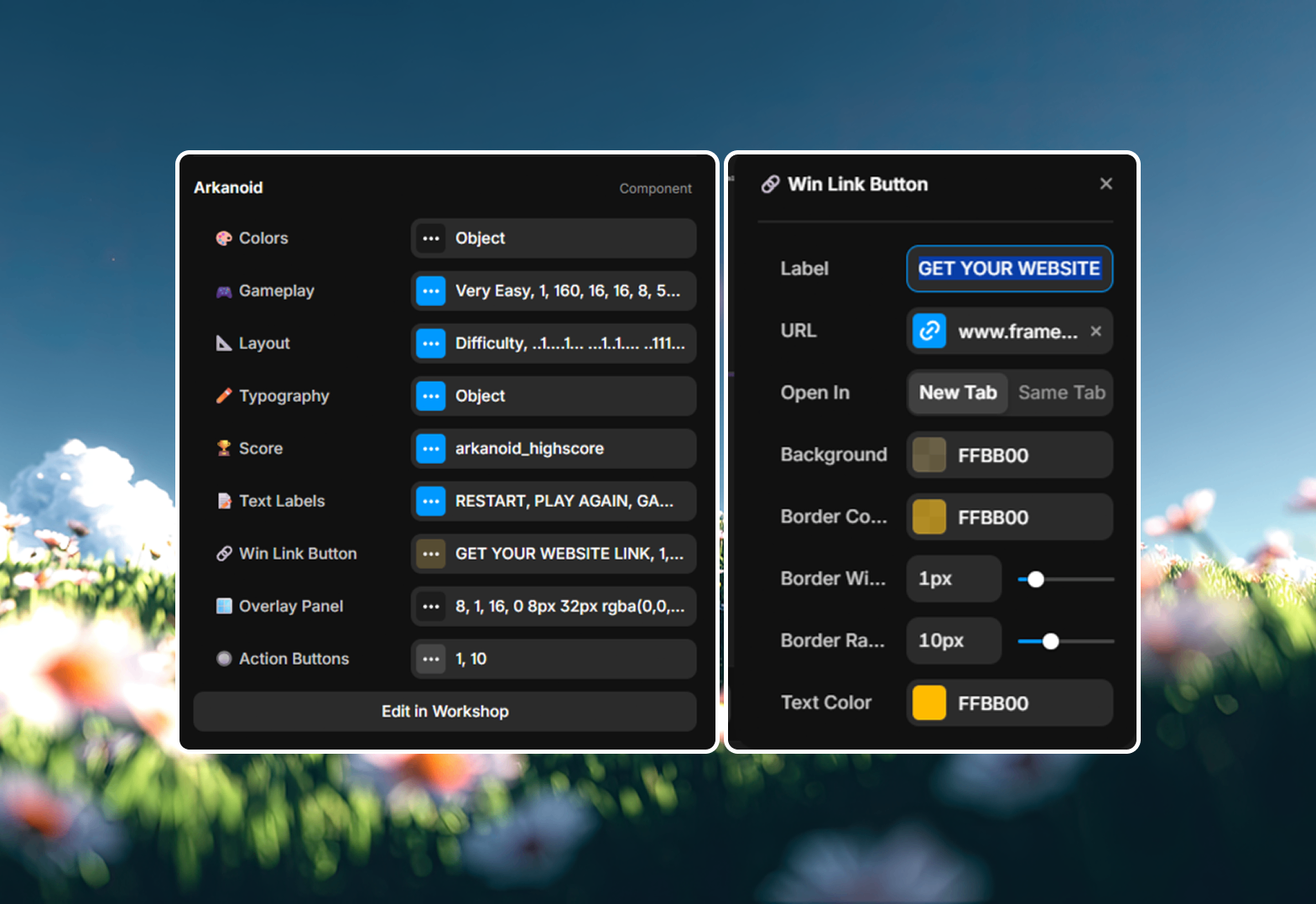 What it doesThe component renders a fully functional game board with physics based gameplay. It handles ball collisions, paddle movement, and brick destruction in real time. To keep things interesting, the game features a secret win link button. Once a player passes a score of 200, this button automatically activates, allowing you to reward your visitors with a discount code, a secret link, or a special download.