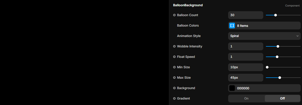 A physics-based floating balloon background with mouse-pop interaction, particle burst effects, and realistic spring tail physics. Four animation styles, gradient balloon shading, and auto-respawn on pop or off-screen exit. Built for celebration pages, children's content, playful brand experiences, and any hero section that needs energetic ambient motion.