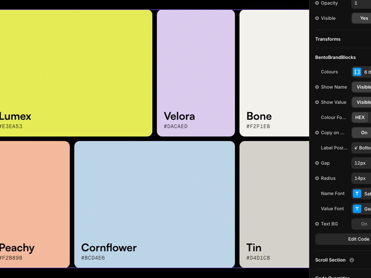 The Bento Brand Block is designed for designers building portfolio case studies or presenting brand identity work in Framer. It gives you a flexible colour palette component that adapts automatically as you add colours, while still giving you full control over typography, formatting, and layout.