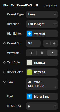 In Reveal Type = Lines, using Highlighted Text with a large positive letter spacing may leave the last character uncovered at the right edge. To fix this, reduce letter spacing to a normal range.
