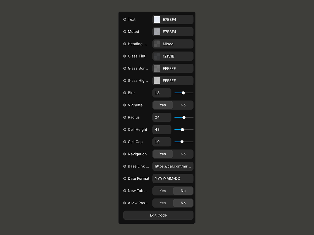 Customizable: Toggle navigation, adjust blur, tint, borders, spacing, cell size, and set a solid heading color via the titleColor prop.