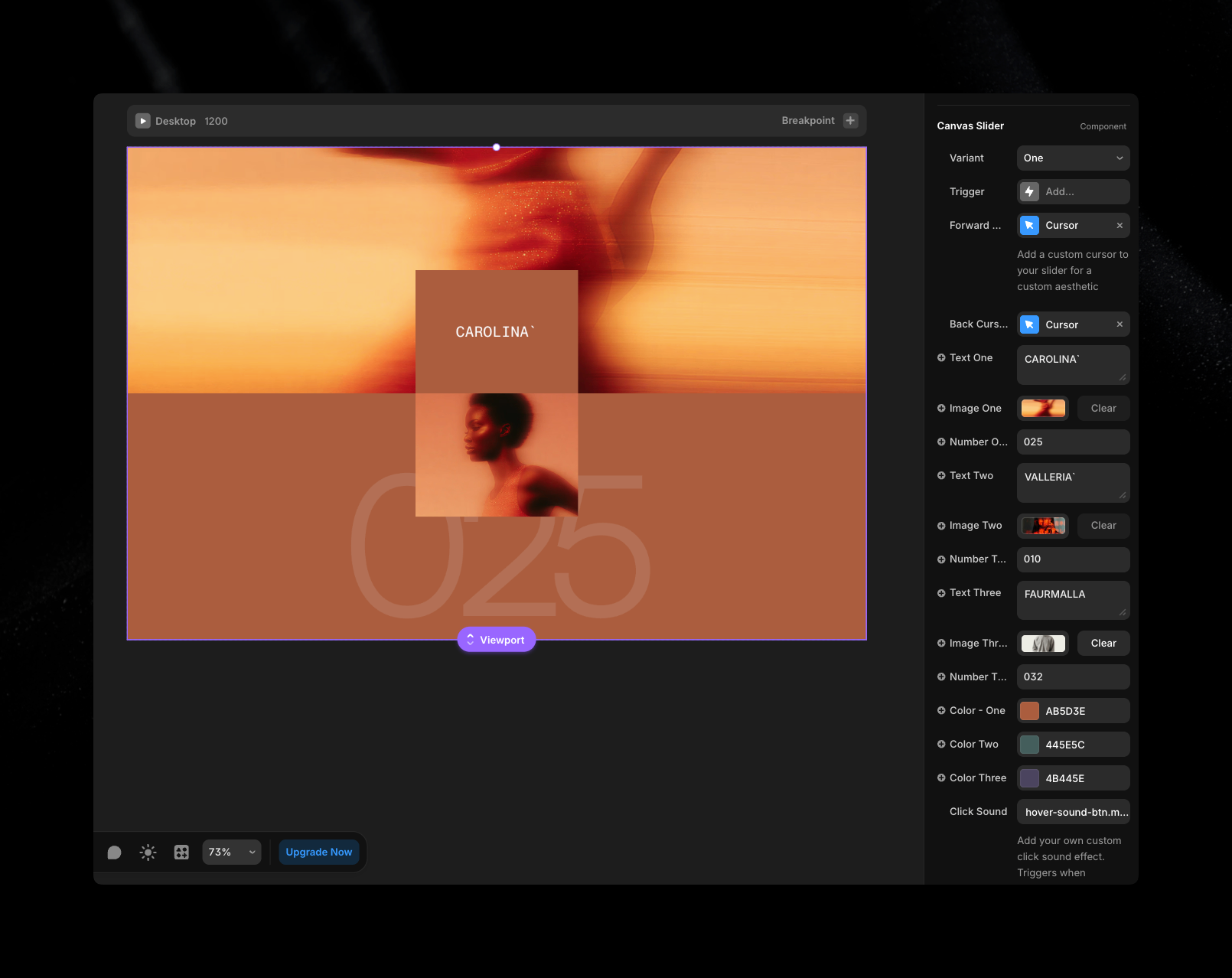 This component creates an immersive slider experience with a full bleed layout built with full customization for imagery, Text, labels and sound support for click interactions.