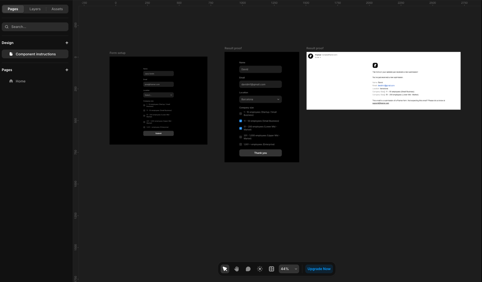 Add the Checkbox Group component inside your Framer form. Define your options directly from the component properties panel by adding labels for each checkbox item. Toggle between single-select or multi-select depending on your use case. Style the component using controls for text color, font, size, checkbox size, and spacing. Once connected to your form, the selected values will automatically be included in the form submission data. Form Submission Result (Working Proof)
