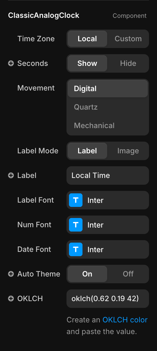 A clean analog world clock component with local and custom GMT support, auto day and night theming, and refined typography controls. Built for dashboards, hero sections, travel sites, and global products that need a live time display with a polished minimal look.