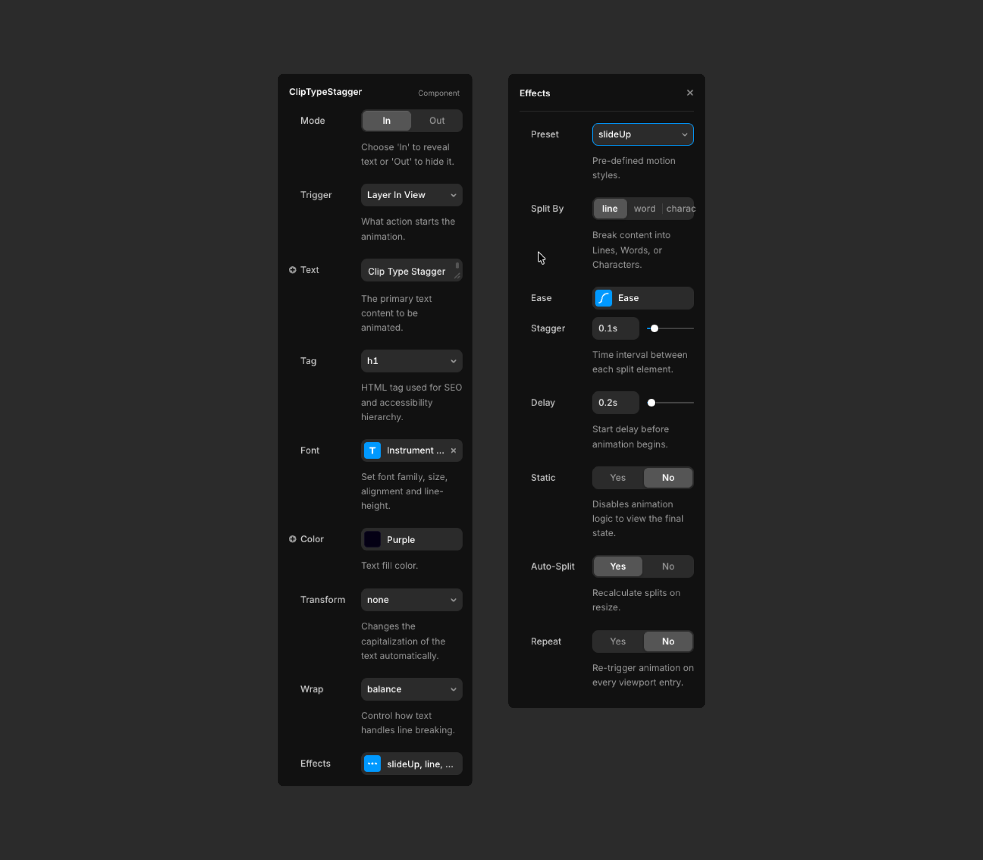 Spring-Powered Staggering: Achieve organic movement using customizable Spring Physics. Control the stagger delay to create elegant "wave" reveals across your typography.