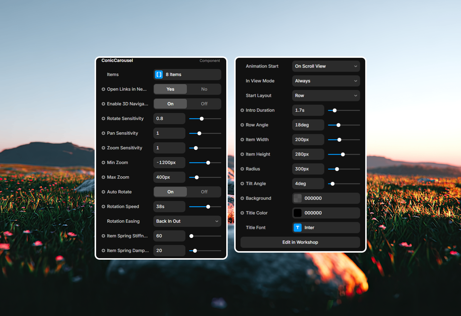 What it doesThe component renders a collection of items in a customizable 3D environment where visitors can rotate, pan, and zoom through your content. It features automatic rotation with customizable easing, smooth intro animations, and highly adjustable layout angles. It utilizes spring-based physics (stiffness and damping) to ensure every movement feels fluid and high end, while ensuring items remain responsive across different viewport sizes.