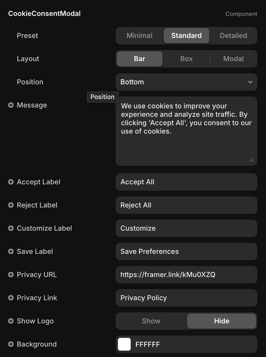 A production-ready cookie consent solution designed for Framer projects that need to meet GDPR requirements without sacrificing design quality. This component combines elegant UI, granular user controls, and smart automation — so you stay compliant while delivering a smooth, trustworthy user experience.