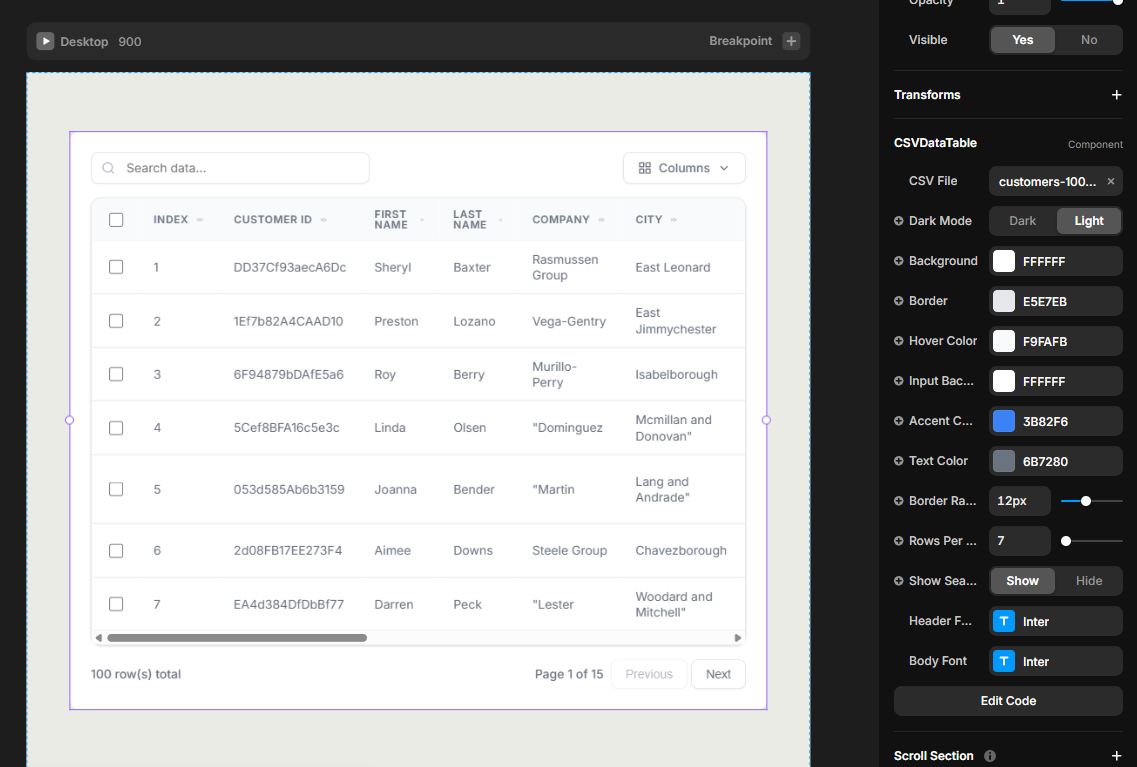A clean, fast CSV data table for Framer with search, sortable columns, pagination, row selection, and a column visibility menu—plus full light/dark theming.