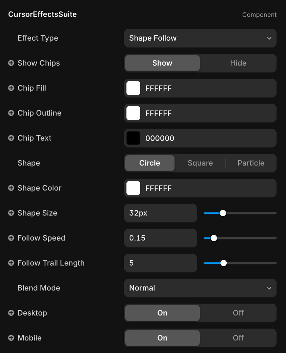 Choose from multiple cursor effects like pixel trail, shape follow, or image trail, then fine-tune speed, decay, blend modes, and color palettes — all inside Framer’s property controls.