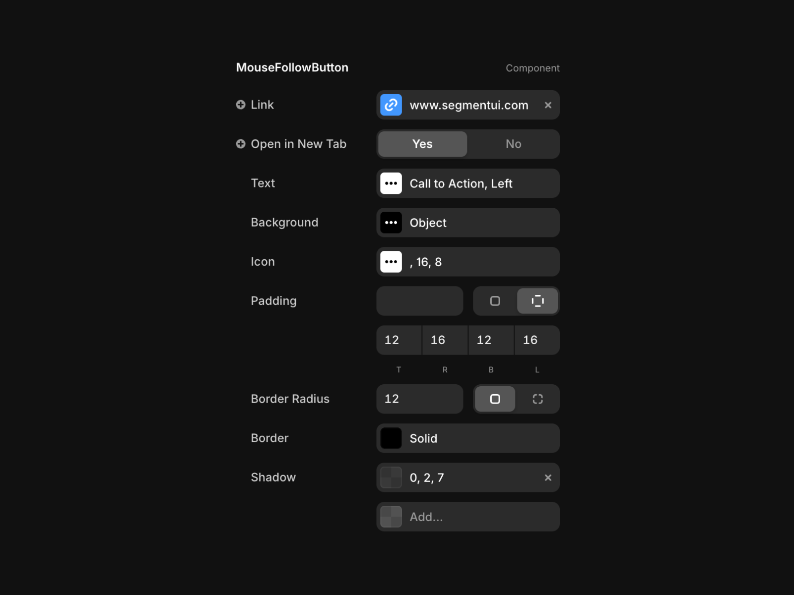 The component comes with a fully customizable button that includes text and icon options. You can toggle the text and icon visibility on or off independently. The icon automatically rotates to follow your mouse cursor. In the properties panel, you'll find controls for Text (content, position, colors, and font), Background (default and hover colors), Icon (custom SVG, colors, size, and spacing), and styling options like padding, border radius, border, and shadow. You can also add a link that opens in the same tab or a new tab.