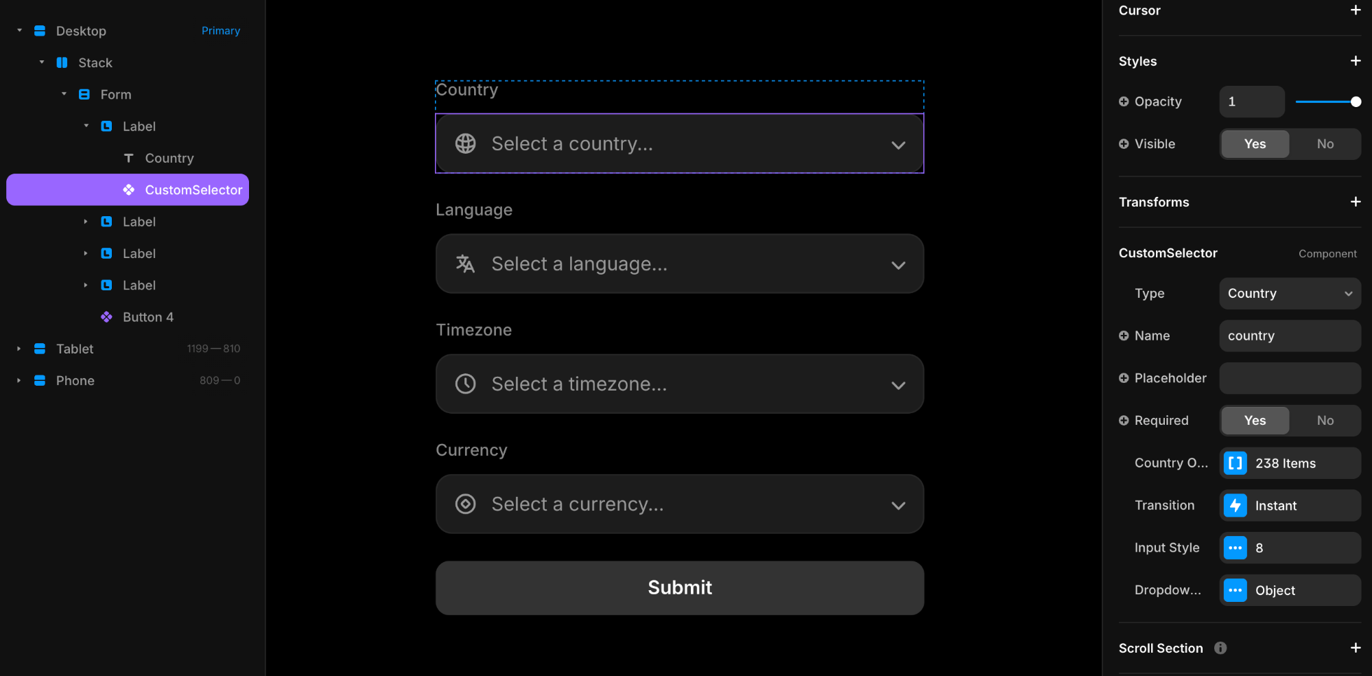 This component is a fully styled dropdown selector for your Framer forms that lets users pick a country, language, timezone, or currency from a searchable list. It comes preloaded with data for all four types that you can customize and works natively with Framer's form submission system - meaning selections get captured and sent just like any other form field, including free email notifications and Google Sheets integrations.