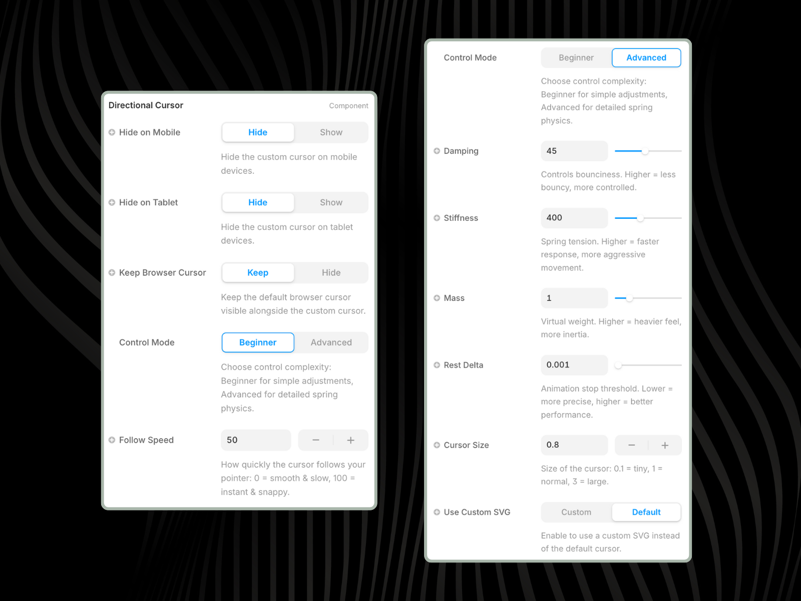 Advanced Spring Settings: Customize damping, stiffness, mass, and rest delta directly for a tailored, physics-driven cursor behavior.